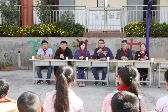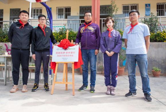 凯叔讲故事孔德伟副总裁、陈达高级经理与会泽县教育局华兴文老师、中国扶贫基金会郭延敬、盐水小学陈校长共同为项目学校盐水小学揭牌。